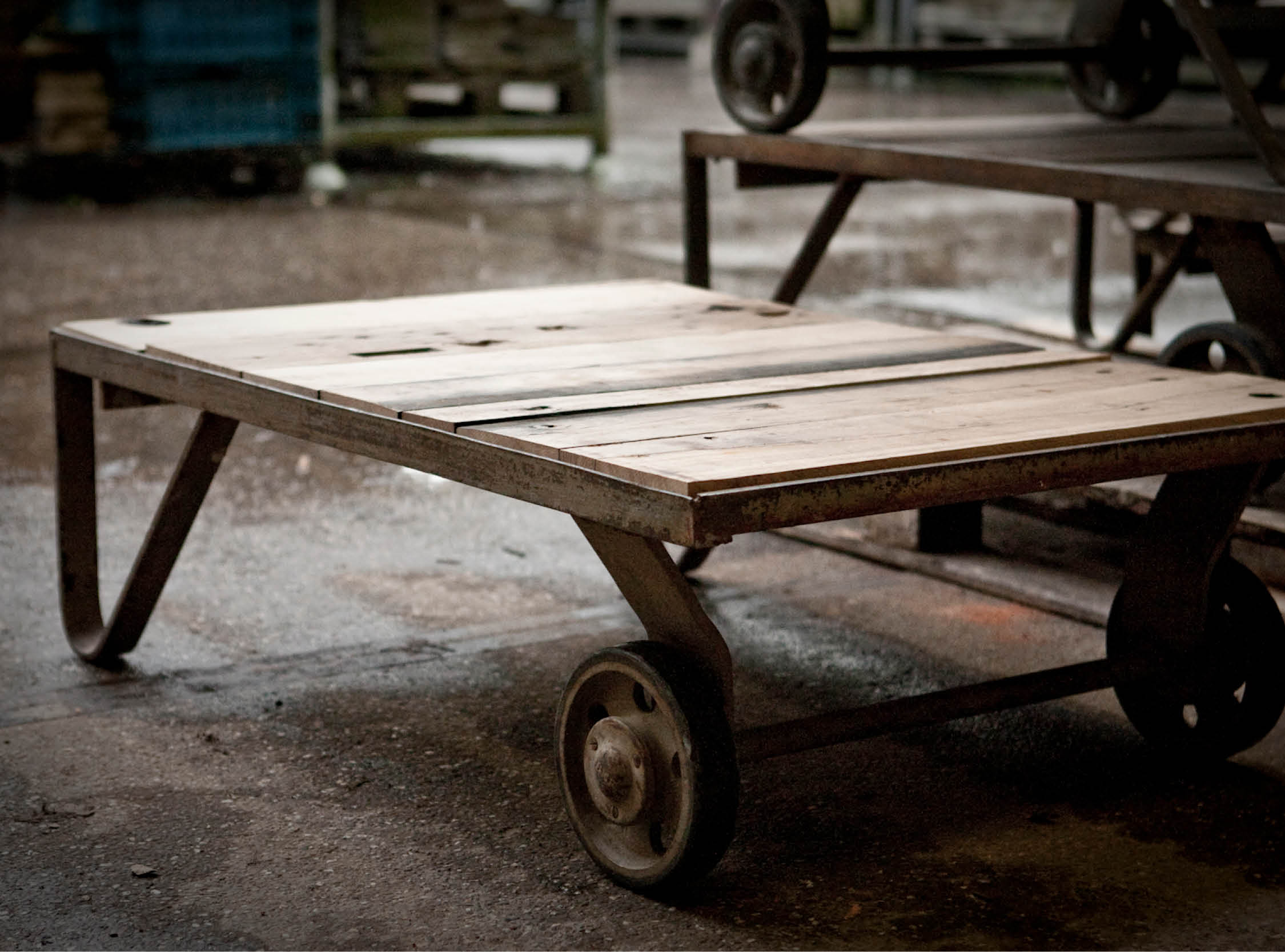 Oude trolleys, gezaagde meerpalen en salontafels op maat, gemaakt van ijzer en oude planken. Ook kleine bijzettafels en statafels zijn te bezichtigen in de showroom van Jan van IJken.